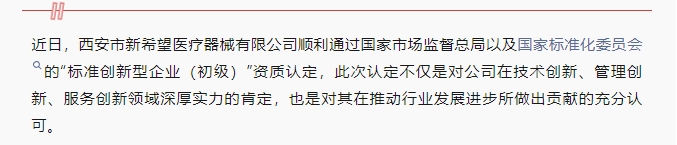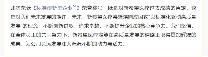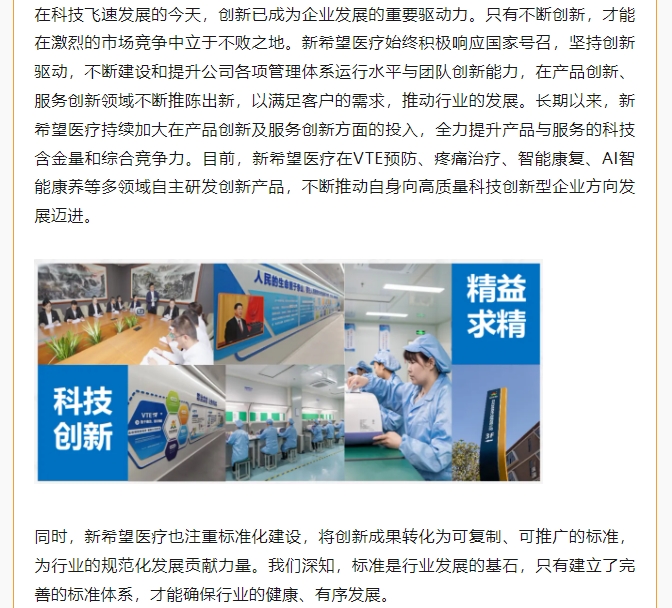 喜訊!新希望醫(yī)療榮獲標準創(chuàng)新型企業(yè)(初級)稱號 2024-07-04 0 上一篇:十年耕耘 共筑美好未來||慶祝新希望醫(yī)療注冊公司十周年 下一篇:新希望醫(yī)療:全國VTE防治能力建設(shè)質(zhì)控提升交流會青島之旅 搜索 最新動態(tài) 2025-09-30 情暖中秋,禮贊國慶 | 新希望醫(yī)療雙節(jié)福利暖心放送! 2025-09-18 銘記九一八 吾輩當自強 | 中共新希望醫(yī)療黨支部、工會組織員工開展愛國主義教育觀影活動 2025-09-03 觀九三閱兵,承先輩遺志,以科技守護生命尊嚴 2025-06-18 新希望醫(yī)療攜創(chuàng)新產(chǎn)品亮相第二屆醫(yī)療器械行業(yè)(西安)高峰論壇,共探產(chǎn)業(yè)發(fā)展新機遇
